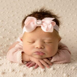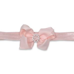 Three blush pink lace bows with pearls on a plush soft elastic headband