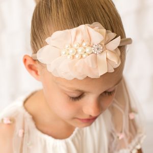 Chiffon flower in peach decorated with pearls and rhinestone on a satin alice band
