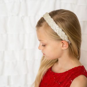 Ivory satin alice band decorated with a pearl bow decorated with rhinestone