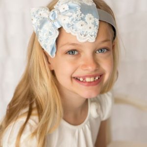Oversized baby blue lace bow on a silver alice band