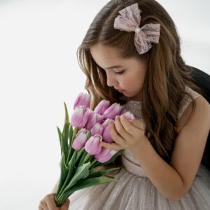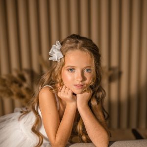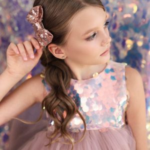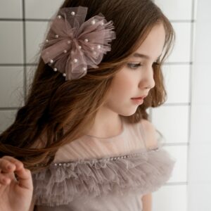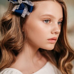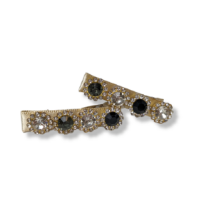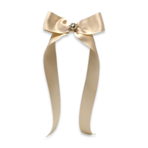 Satin bow with long tails and gold rhinestone button on an alligator clip- colours available