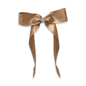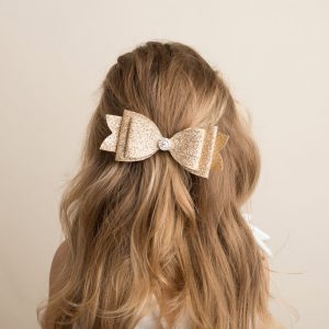 Oversized 6’’ grosgrain bow with rhinestone button on an alligator clip.