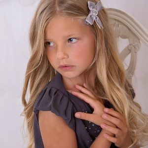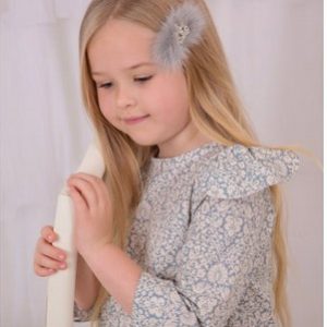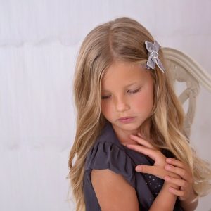 Grey mink fur bow with sparkly rhinestone crown on an alligator clip.