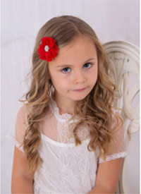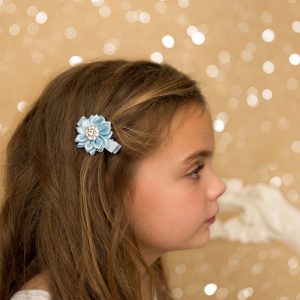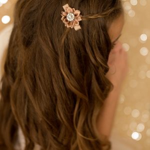 Chocolate satin flower with rhinestone button on an alligator clip.