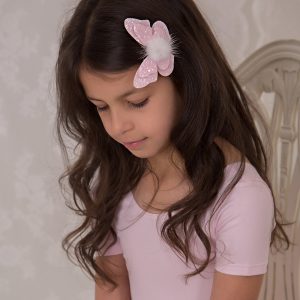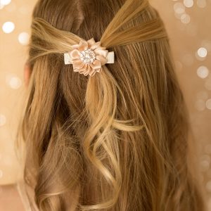 Ivory and gold tulle glitter flower with rhinestone on a alligator clip.