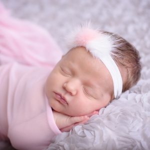 Three blush pink lace bows with pearls on a plush soft elastic headband