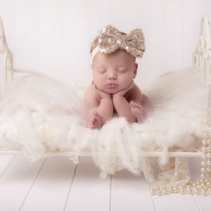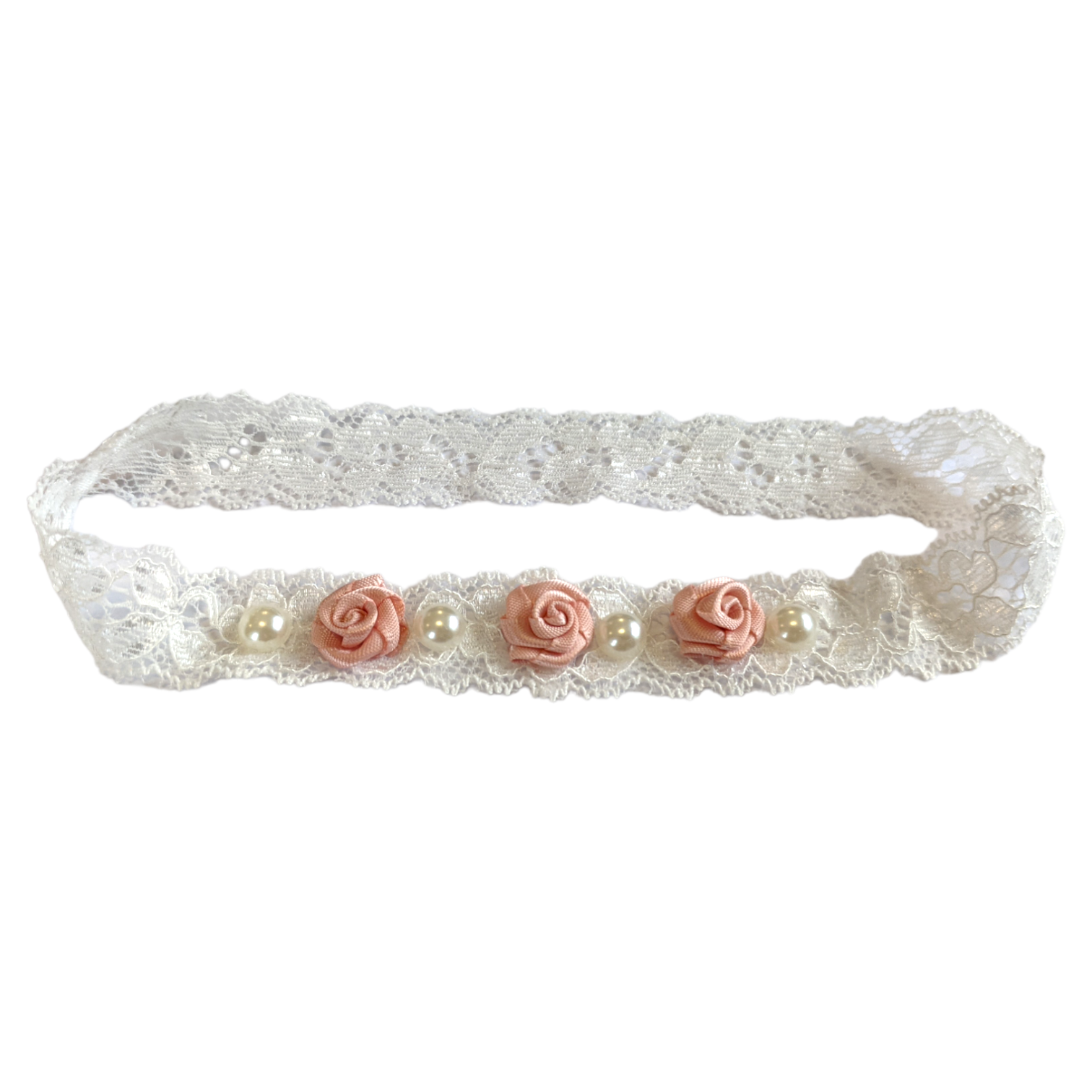Lace headband with champagne satin flowers and pearls