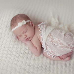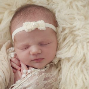 Beautiful ivory frilly bow finished with pearl on an ivory soft elastic headband
