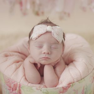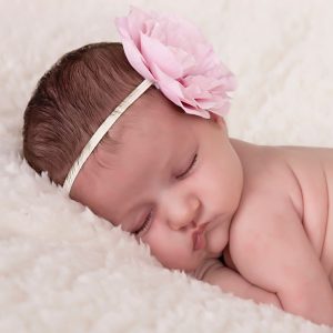 Beautiful dusky pink satin flower decorated with pearl on a delicate lace headband