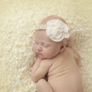 Delicate ivory chiffon flower decorated with pearl and stone diamanté centre on a soft elastic headband finished with an exclusive pearl and diamanté trim