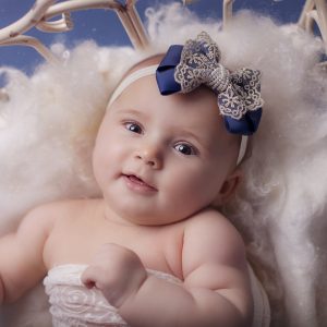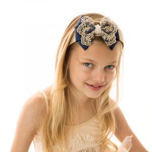 Navy oversized bow with gold lace and pearls on a soft elastic headband