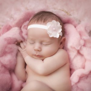 Pink chiffon flower with rhinestone on soft elastic lace headband