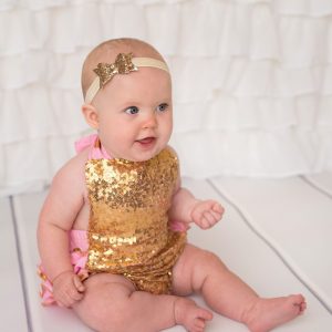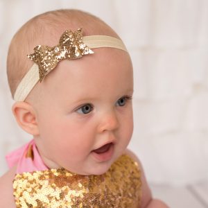 Gold sequin bow decorated with a beautiful pearl and diamante rhinestone on a soft elastic headband