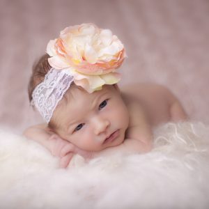 Peach flower with pearl and rhinestone button on soft lace headband