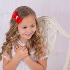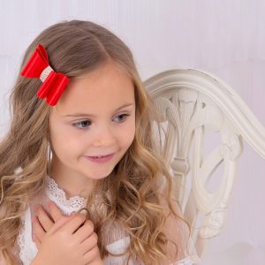 Satin stiff red bow with long rhinestone button on an alligator clip