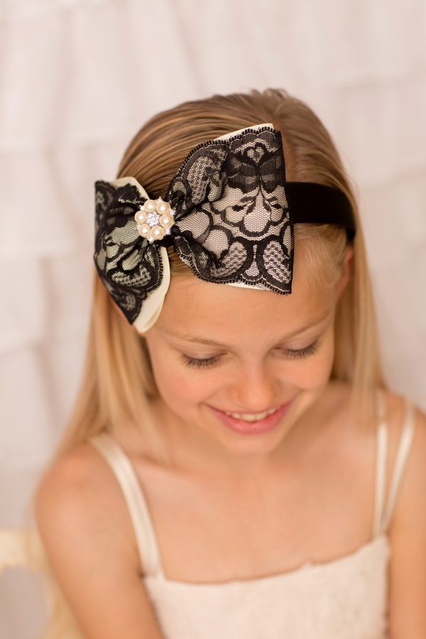 Outlet, Sale, Solid headbandsBlack and ivory oversized satin and lace bow decorated with pearl and diamante rhinestone. The alice band is wrapped with black satin.