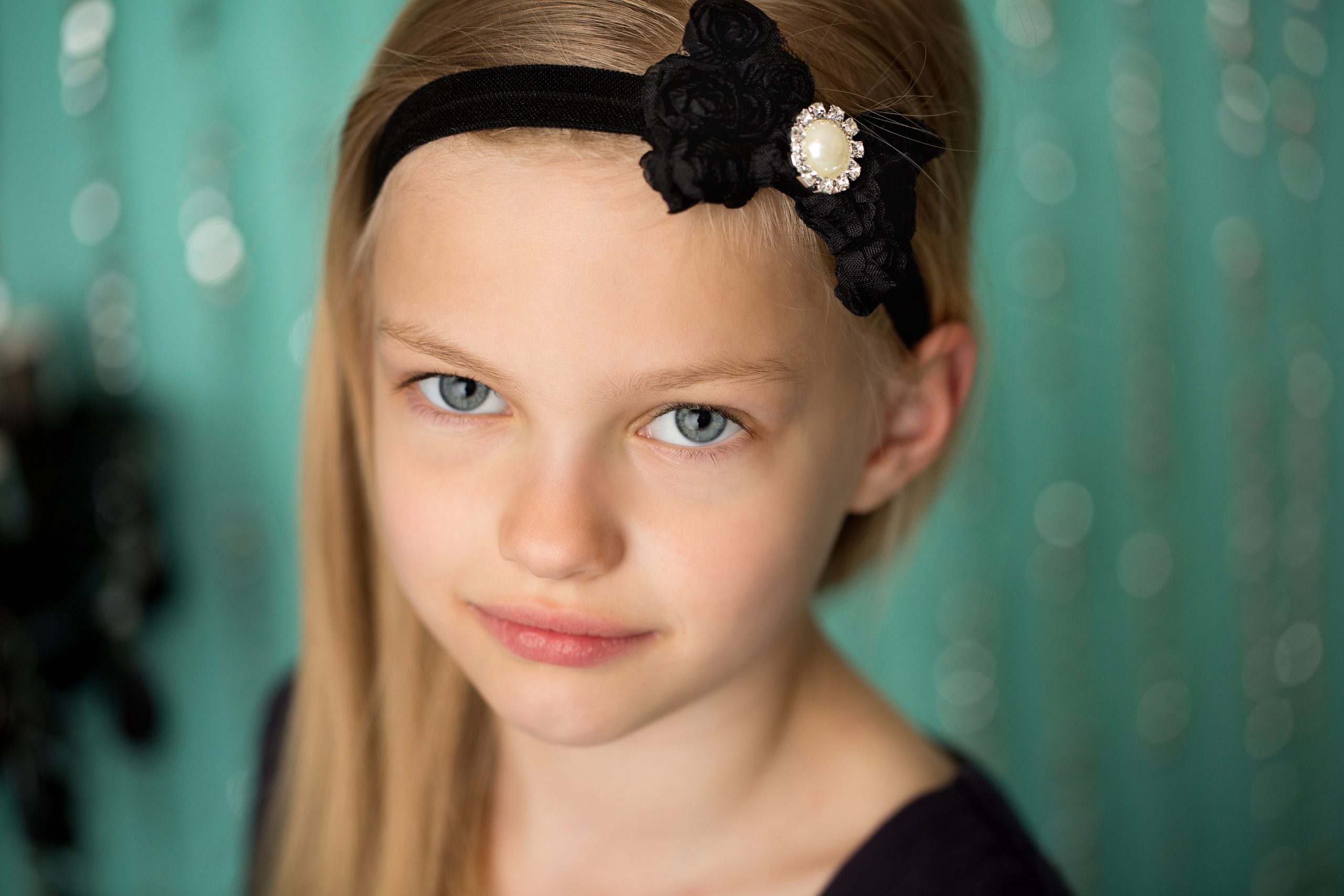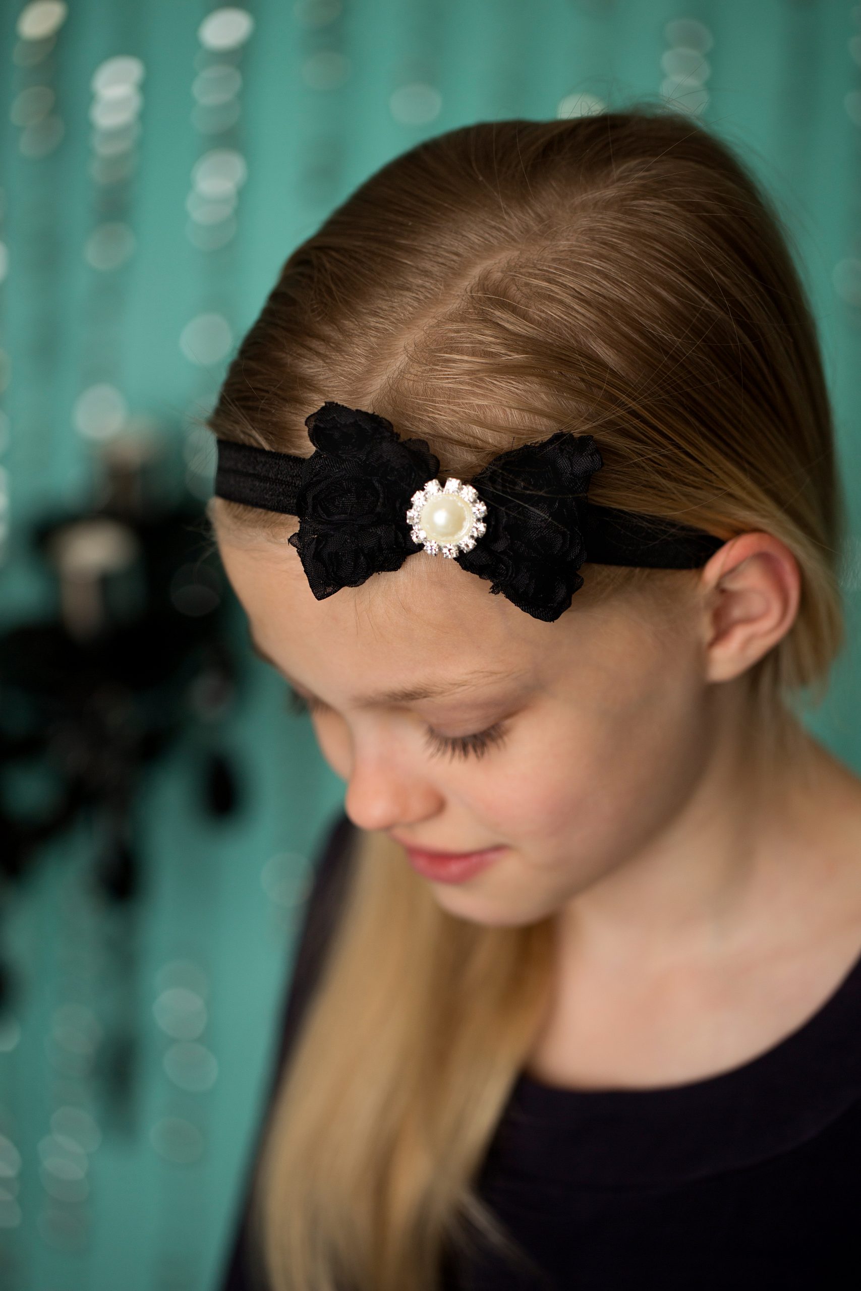 Beautiful black rose chiffon bow decorated with a stunning large rhinestone on a soft elastic headband
