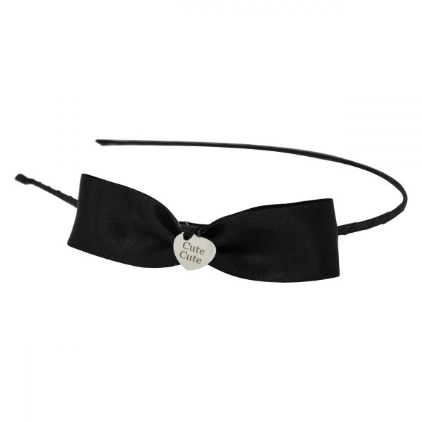 Black single bow with silver heart on a slim alice band.