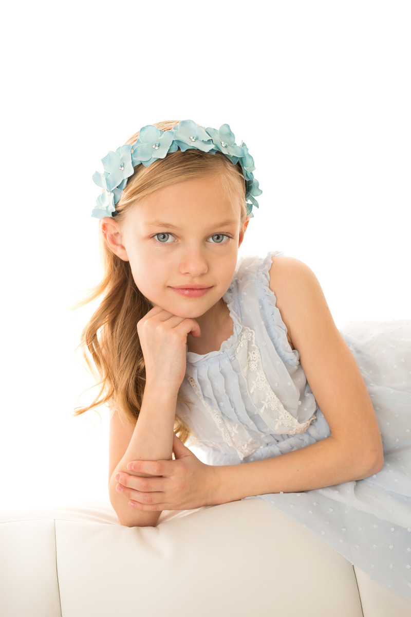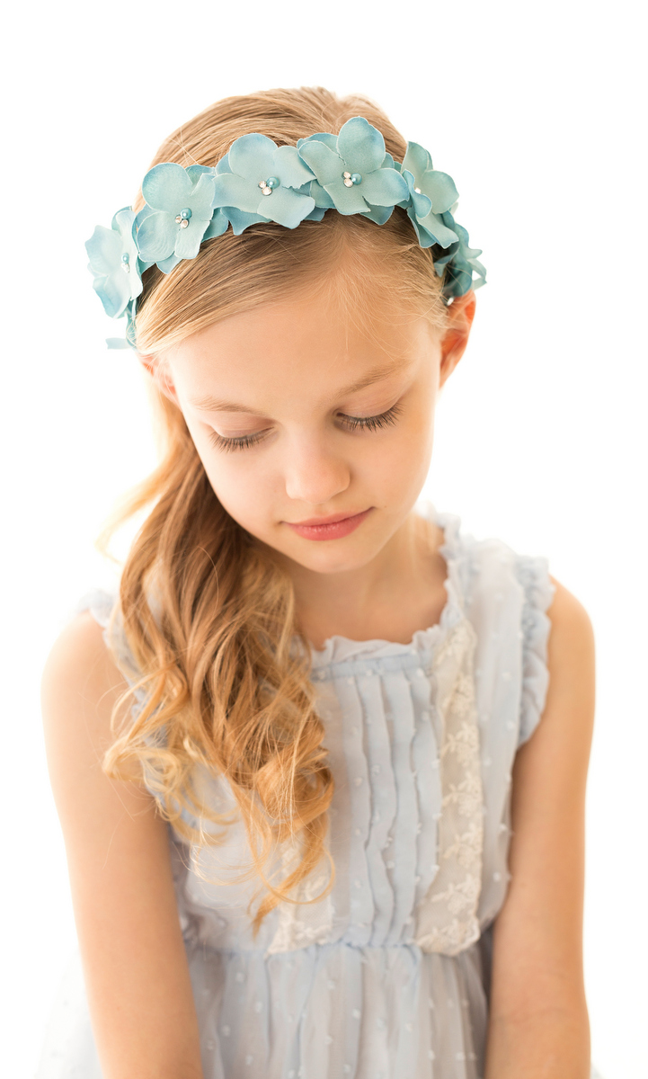 Blue flowers decorated with Swarovski crystals and pearls on alice band