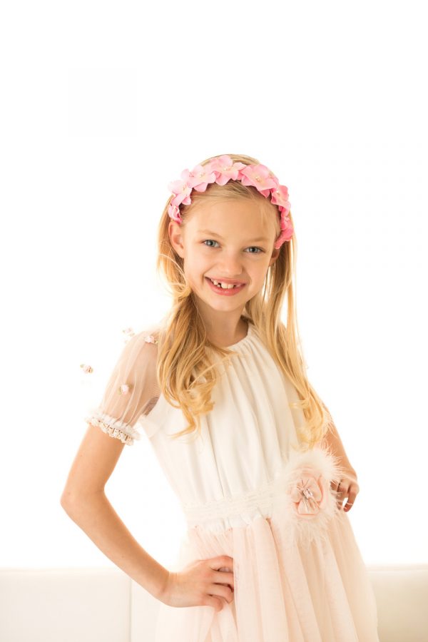 Bright pink flowers decorated with Swarovski crystals on alice band