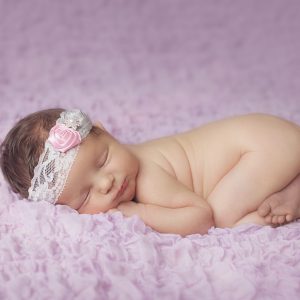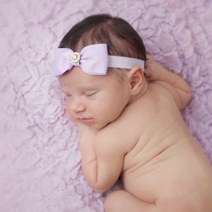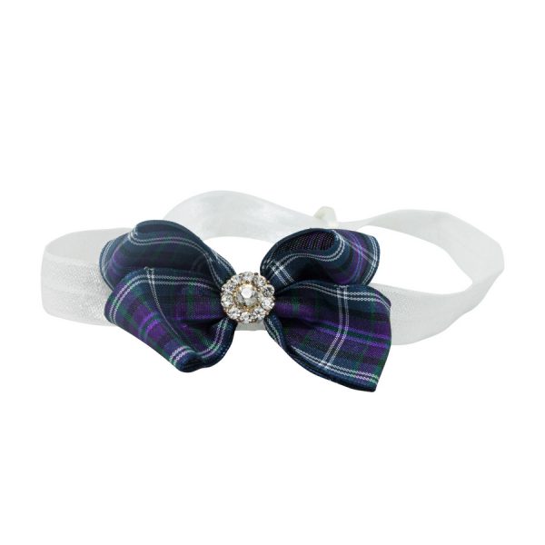 Checked purple and white gingham medium bow with rhinestone button on a soft headband