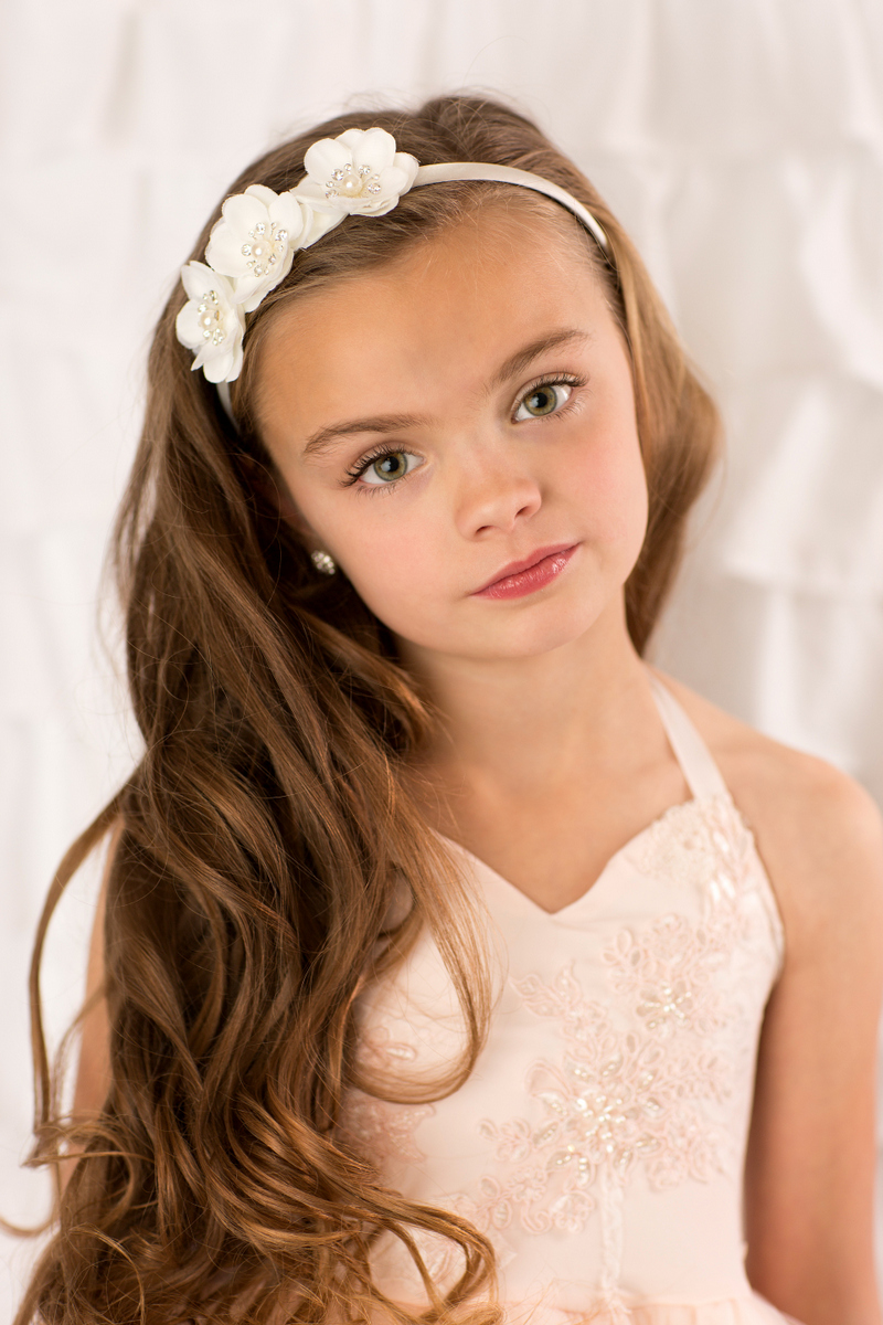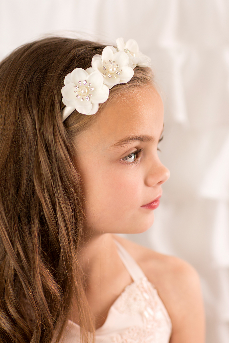 Delicate brown frayed flower finished with pearl on a soft ivory elastic headband