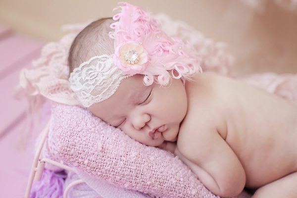 Exclusive candy pink goose feather with Swarovski crystals and pink flower on a wide lace headband