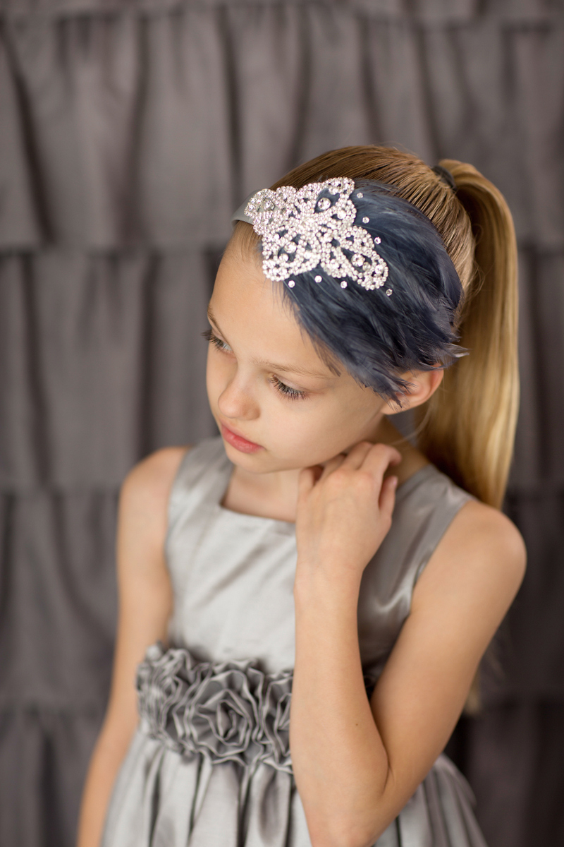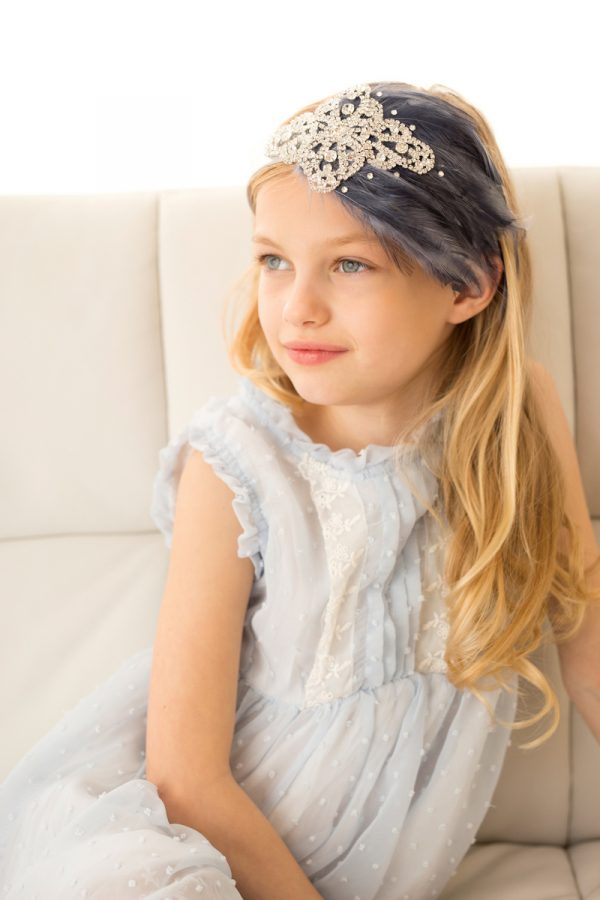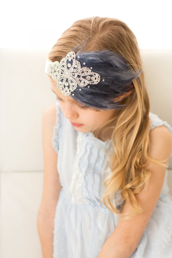 Exclusive denim feather decorated with Swarovski crystals and crystal design  satin alice band