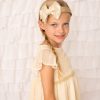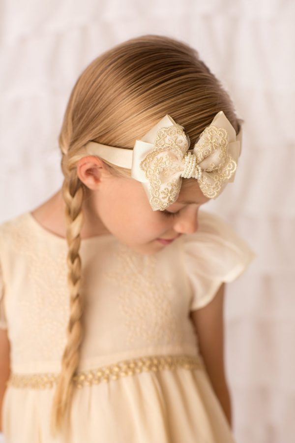 Ivory satin and gold lace bow decorated with stunning pearl trim on a soft elastic headband