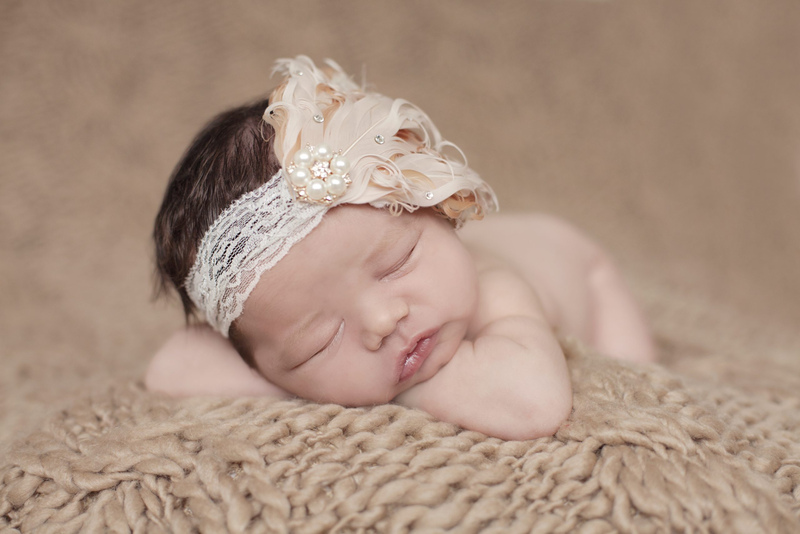 Exclusive, Hair Accessories, Headbands, PartyExclusive tan and brown goose feather sprinkled with Swarovski crystals finished with a large pearl rhinestone on wide ivory elastic lace.
