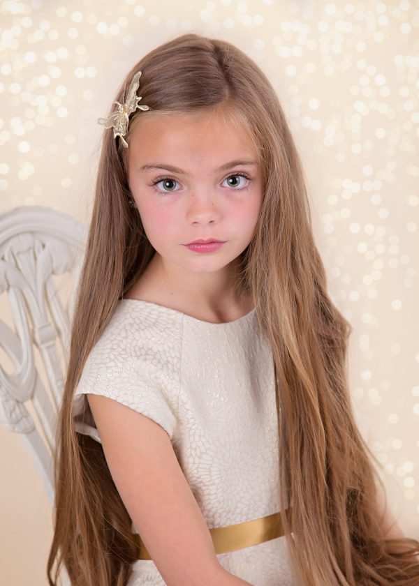 Gold butterfly with gold cased rhinestones on an alligator clip.