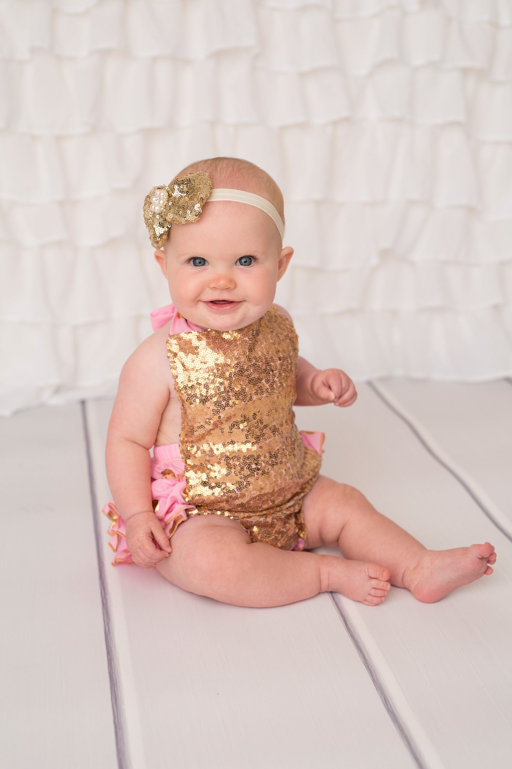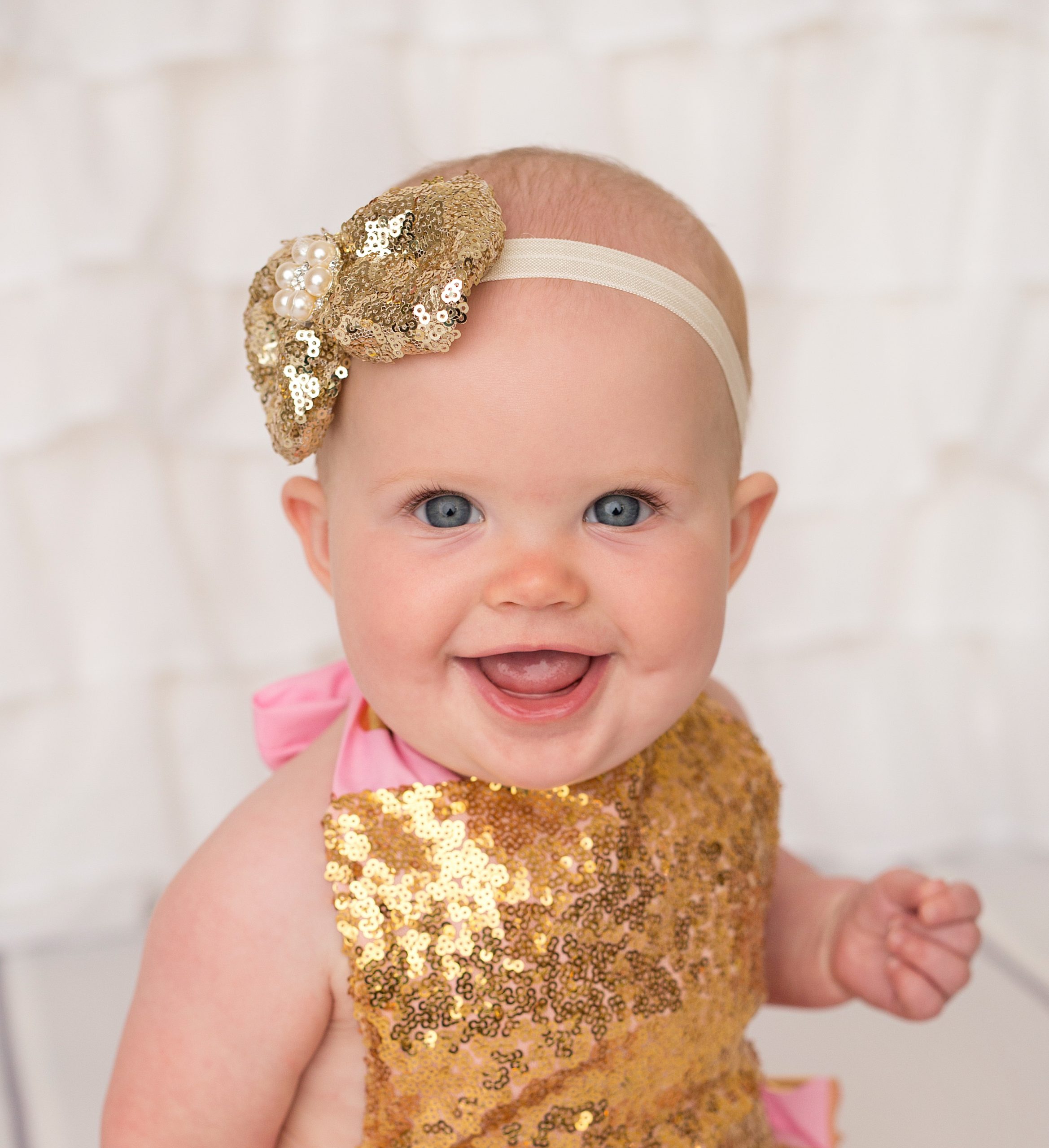 Gold sequin bow decorated with a beautiful pearl and diamante rhinestone on a soft elastic headband
