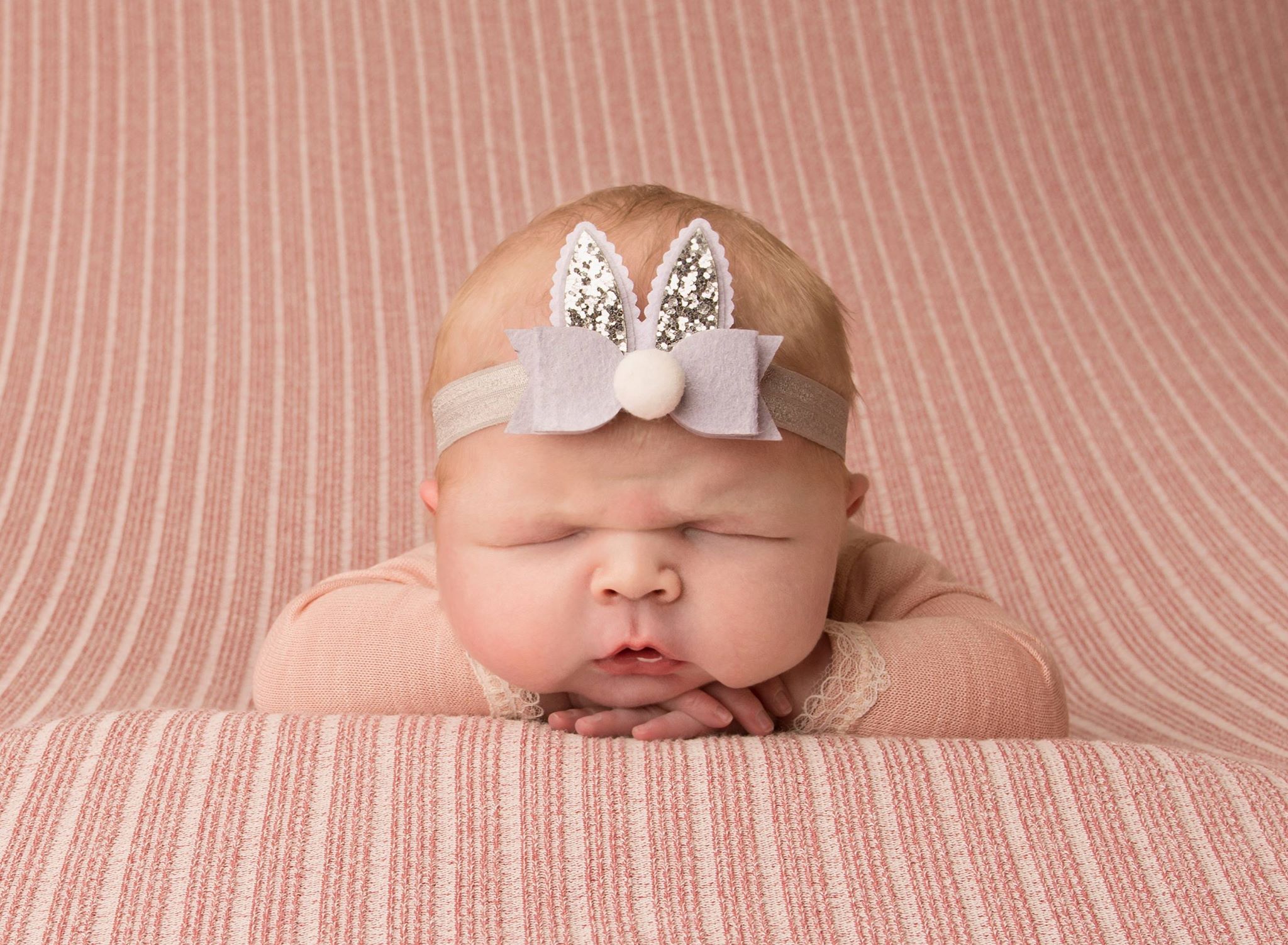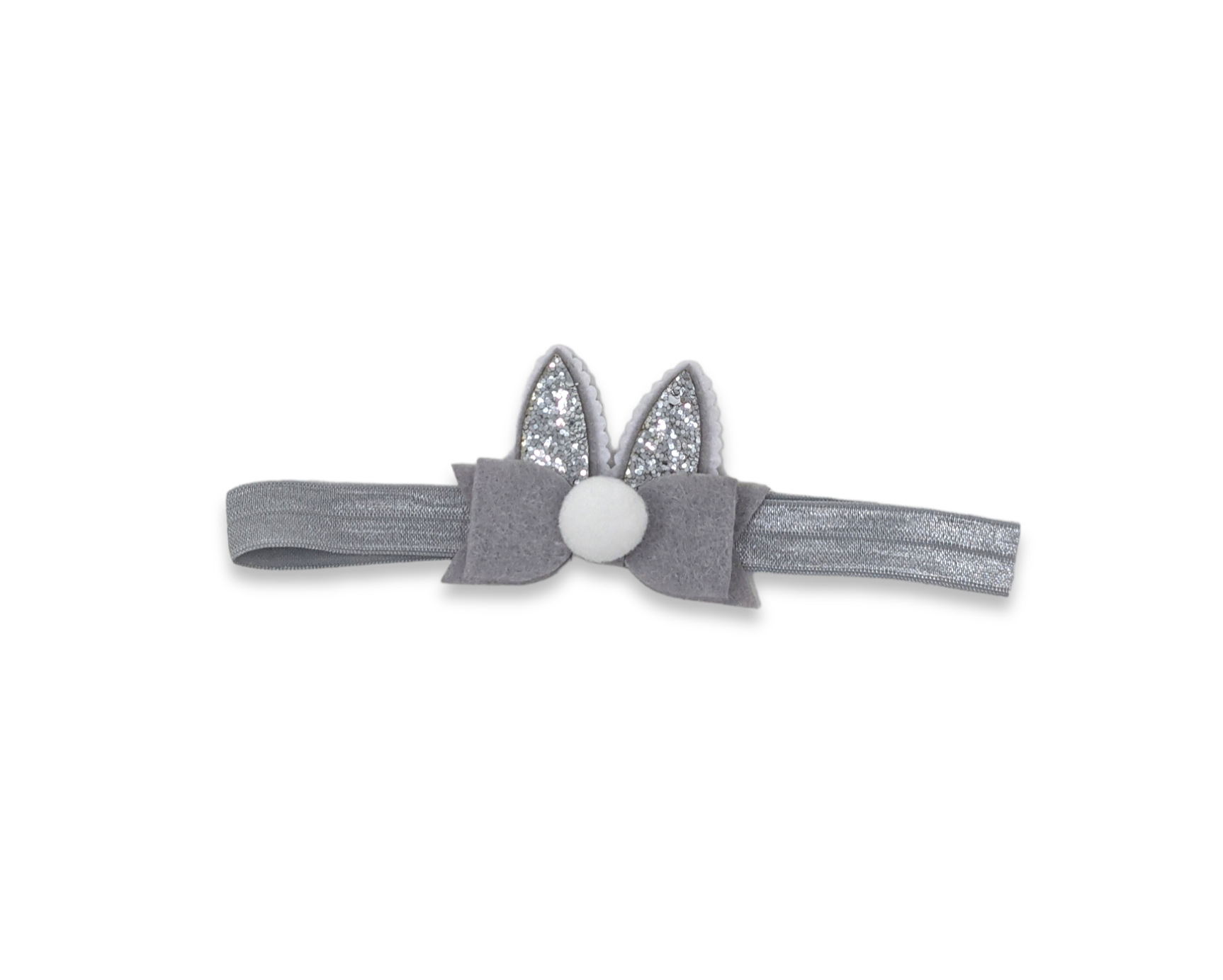 Grey bunny ears with glitter and pom pom on a soft elastic headband