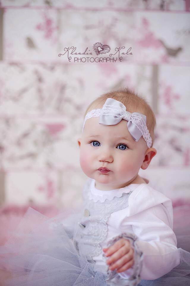 Light grey grosgrain bow finished with delicate lace trim a soft elastic headband