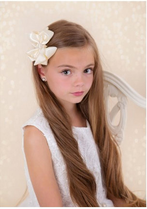 Ivory double satin bow with a rhinestone button on a alligator clip.