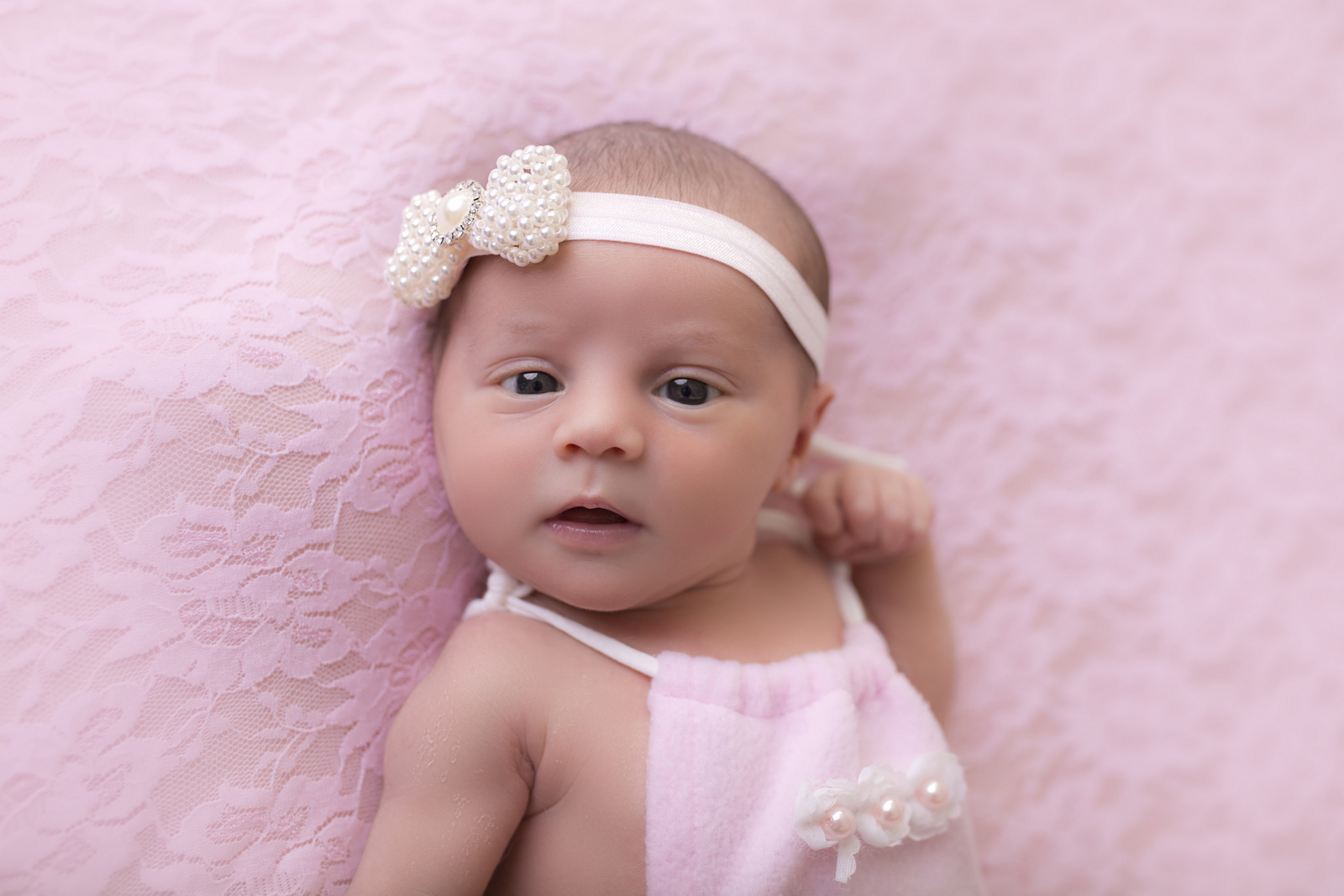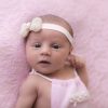 Ivory pearl bow with rhinestone on pink elastic headband.