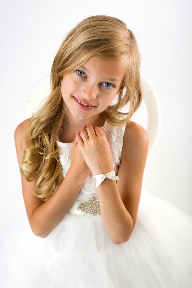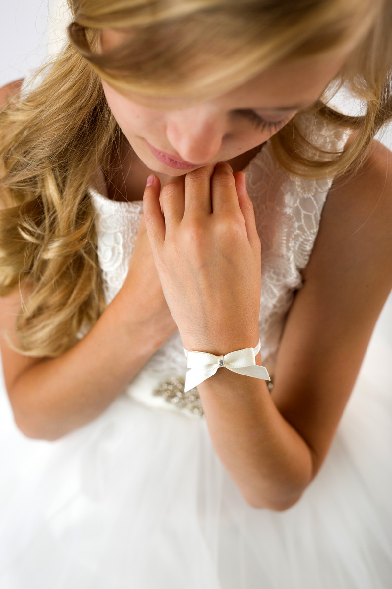Ivory satin small bow with Swarovski on a soft elastic bracelet.