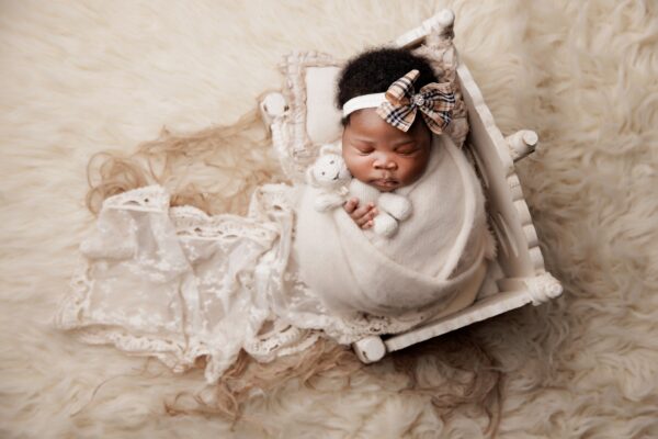 Large double tartan bow in beige and black with rhinestone on a elastic headband.