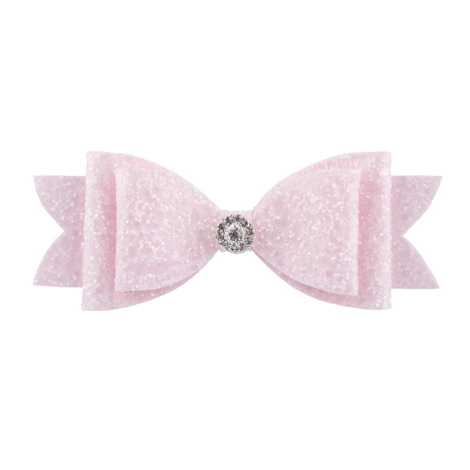 Large light pink glitter bow with rhinestone on a clip.
