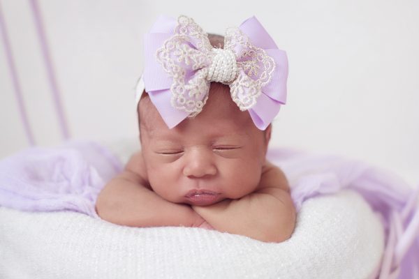 Lilac oversized bow with gold lace and pearls on a soft elastic headband.