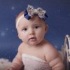 Navy oversized bow with gold lace and pearls on a soft elastic headband.