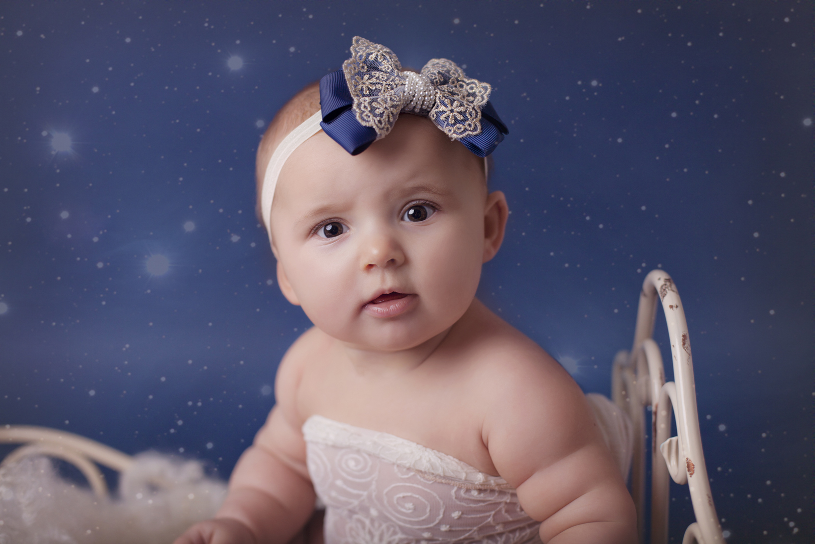 Navy oversized bow with gold lace and pearls on a soft elastic headband
