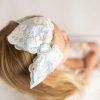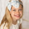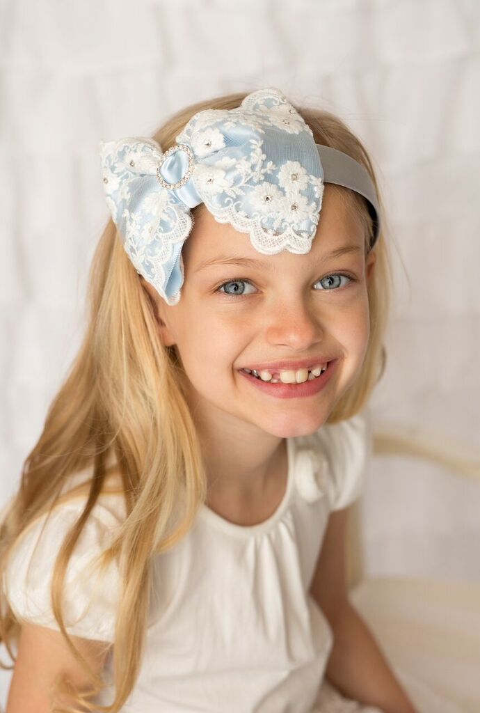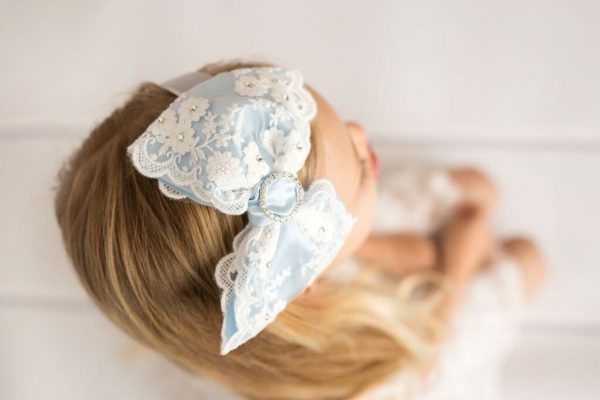Oversized baby blue lace bow on a silver alice band