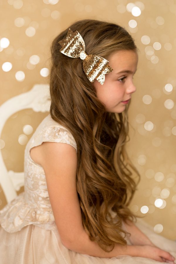 Pale gold glitter large bow with rhinestone on a clip