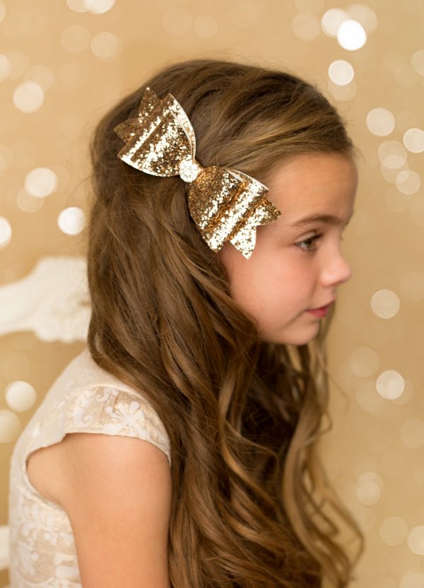 Bows, Hair AccessoriesLarge pale gold glitter bow with rhinestone on a clip.