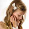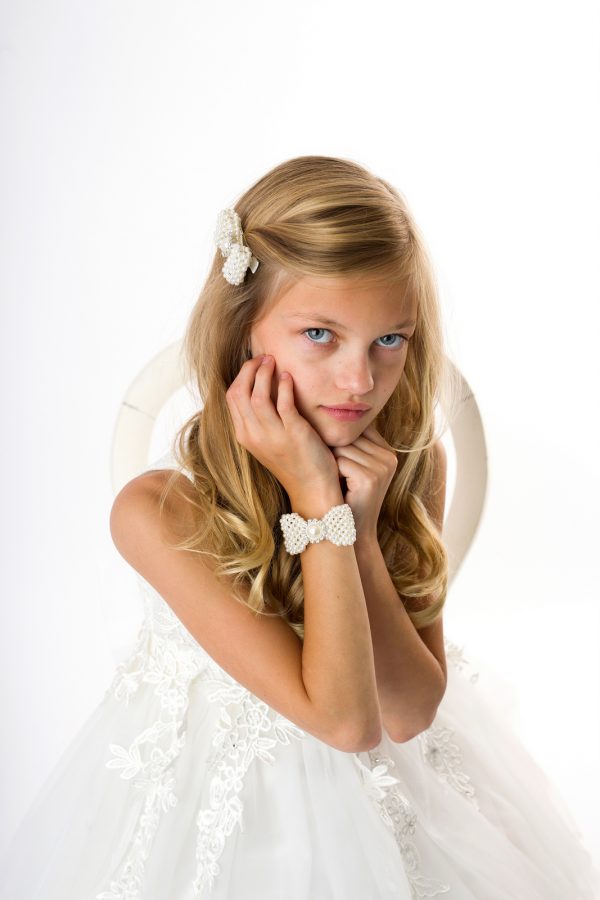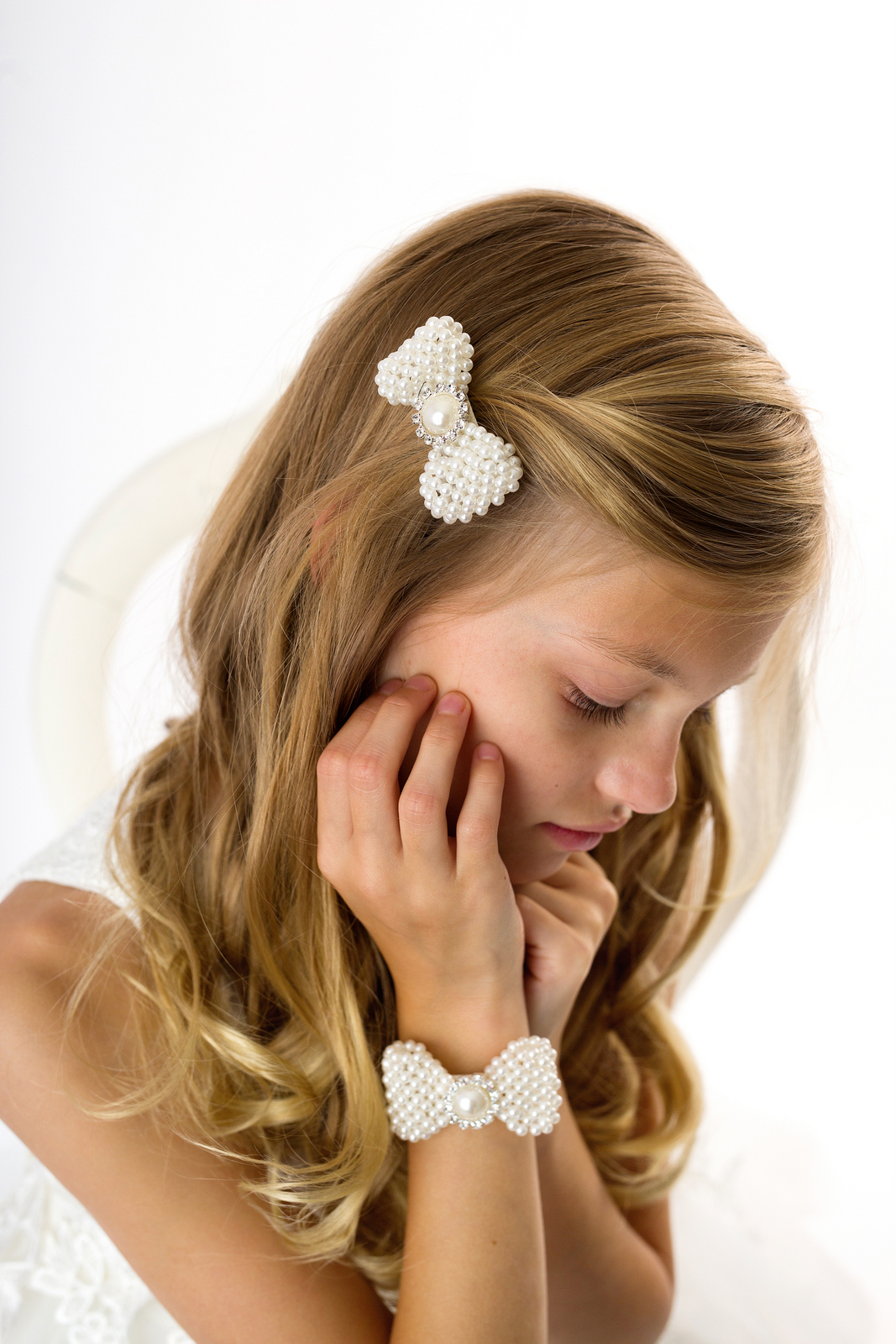BraceletsIvory pearl bow with pearl and rhinestone button on soft elastic bracelet.