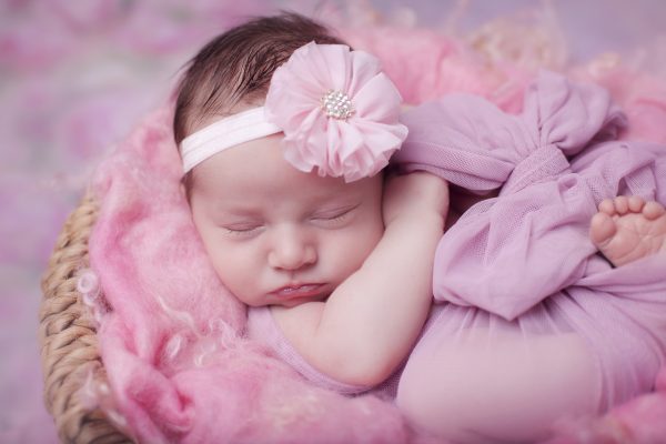 Pink chiffon flower with sparkly rhinestone on a soft elastic headband.