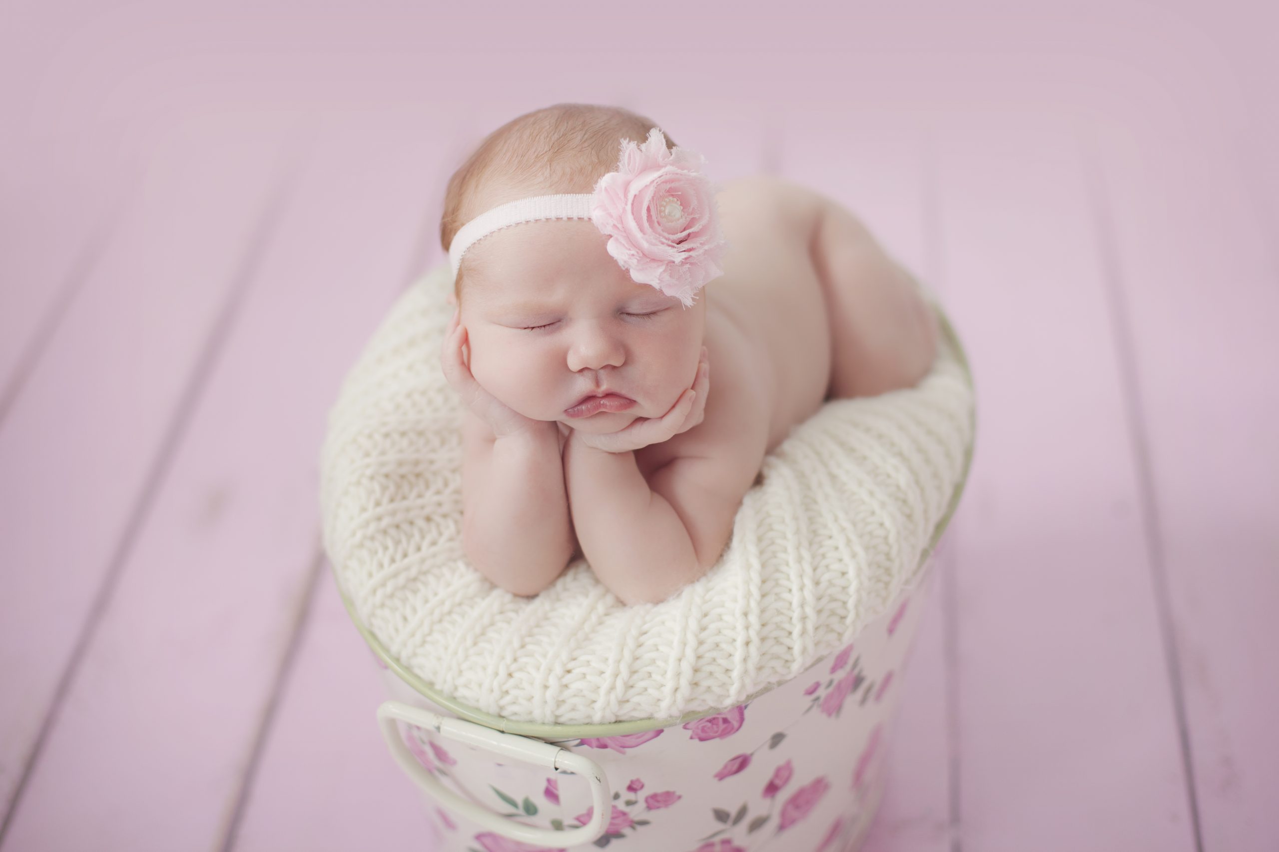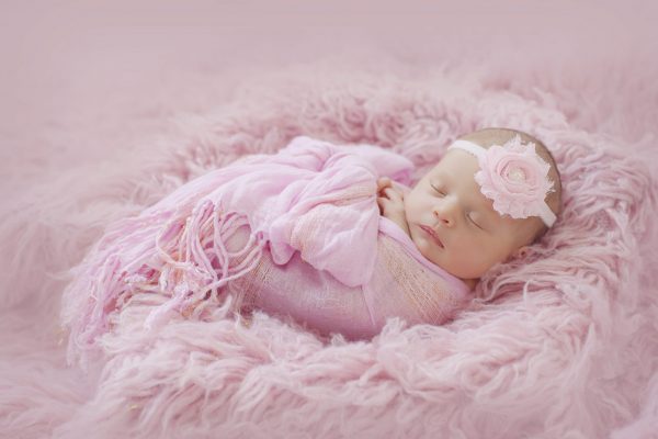 Beautiful pink frayed flower finished with pearl on a soft elastic headband