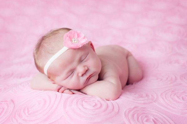 Pink satin flower decorated with rhinestone a soft elastic headband.
