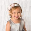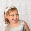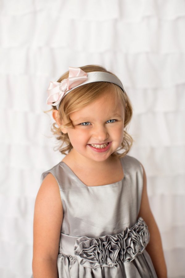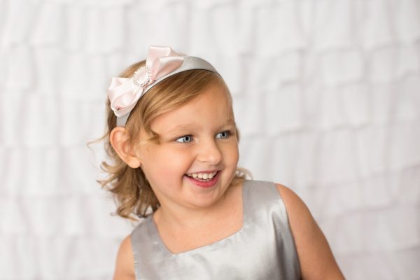 Beautiful pink satin bow decorated with a round diamante buckle. The alice band is wrapped with silver satin.